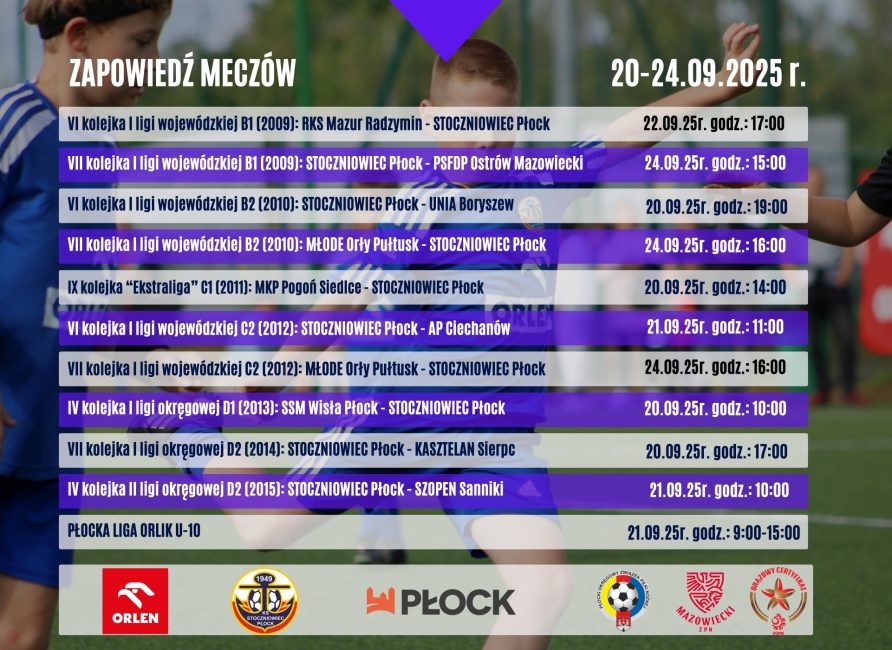 Intensywny tydzień przed młodymi Żeglarzami. W najbliższych dniach czeka nas aż dziesięć ligowych spotkań w rozgrywkach młodzieżowych. Zagramy również w Płockiej Lidze Orlik U-10.